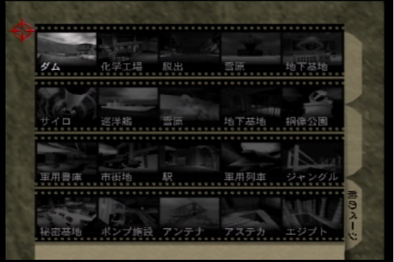 2 通常プレイ編 ステージ01 ダム ステージ02 化学工場 ステージ03 脱出 ステージ04 雪原1 ステージ05 地下基地1 ステージ06 サイロ ステージ07 巡洋艦 ステージ08 雪原2 ステージ09 地下基地2 ステージ10 銅像公園 ステージ11 軍用書庫 ステージ12 市街地 ステージ13 駅 ステージ14 軍用列車 ステージ15 ジャングル ステージ16 秘密基地 ステージ17 ポンプ施設 ステージ18 アンテナ |
